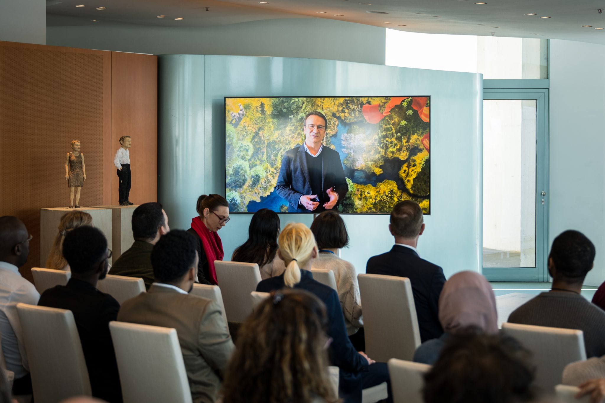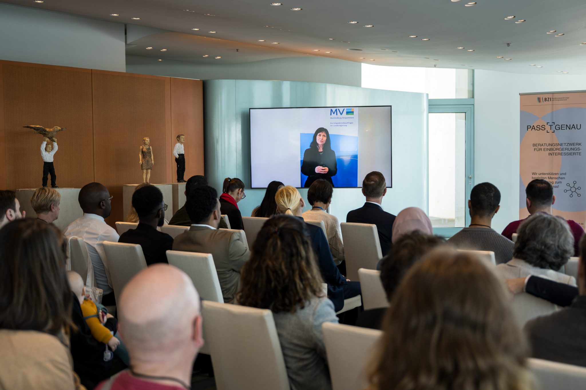Angereist aus Mecklenburg-Vorpommern und Rheinland-Pfalz wurden 24 frisch geschulte Lots*innen von Staatsministerin Frau Reem Alabali-Radovan, Beauftragte der Bundesregierung für Migration, Flüchtlinge und Integration, zugleich Beauftragte der Bundesregierung für Antirassismus, im festlichen Bankettsaal begrüßt. Die Staatsministerin, welche das Projekt Pass[t] Genau fördert, hob die Bedeutung von community-basierter Einbürgerungsberatung hervor, da der Weg zum deutschen Pass lang und kompliziert sein kann. Die Integrationsbeauftragten von Rheinland Pfalz, Miguel Vicente, und aus Mecklenburg-Vorpommern, Jana Michael, richteten sich in digitalen Grußworten an die Lots*innen und betonten die gute Zusammenarbeit vor Ort sowie die Entlastung durch Pass[t] Genau.