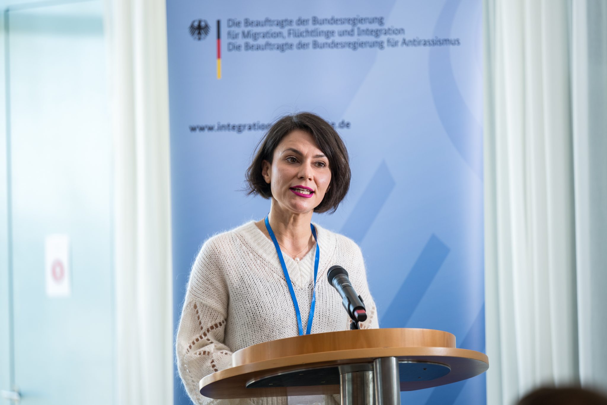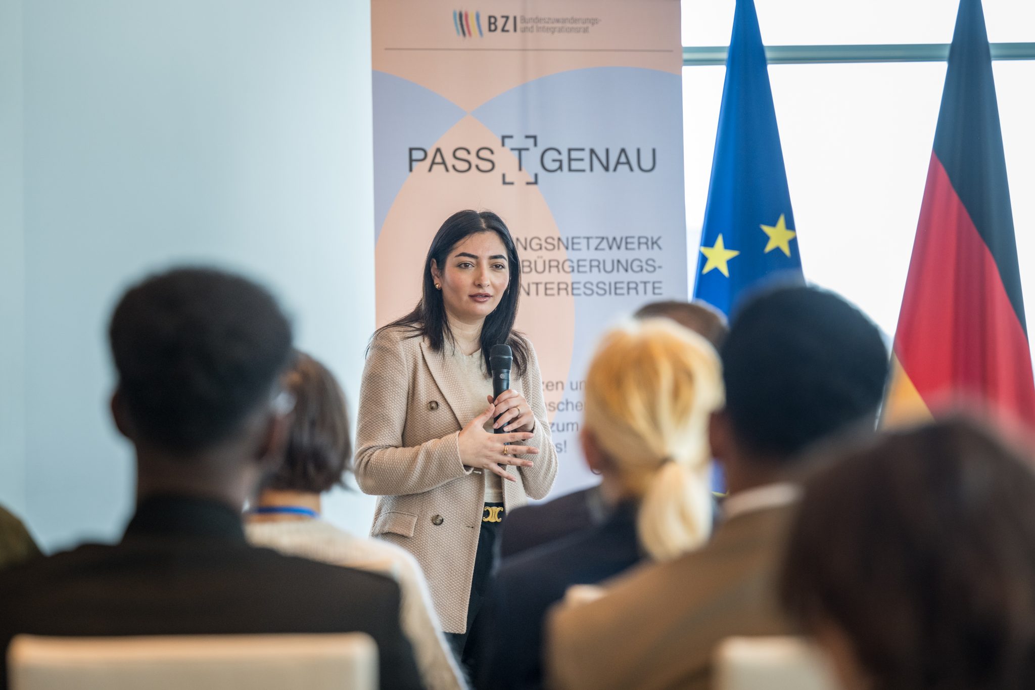 Im Namen des Bundeszuwanderungs- und Integrationsrats (BZI, dem Trägerverein von Pass[t] Genau, sprach die Vorsitzende Didem Karabulut. Sie verwies auf die Bedeutung der Beiräte als Ort der politischen Teilhabe und als Brücke zu ehrenamtlichem Engagement. Viele Einbürgerungslots*innen sind selbst in Migrations-, Ausländer- und Integrationsbeiräten engagiert und darüber zu Pass[t] Genau gelangt. Von ihrem Werdegang und ihrem Weg zur ehrenamtlichen Tätigkeit bei Pass[t] Genau berichteten danach die Lots*innen Wadad und Wael. Beide haben selbst ein Einbürgerungsverfahren durchlaufen bzw. stecken noch im Prozess, und wissen daher um die Notwendigkeit von Unterstützung auf diesem Weg. Nach den Redebeiträgen gab einen Austausch mit der Staatsministerin und die Lots*innen konnten Fragen stellen. Diese drehten sich u.a. um die Erfahrungen der Staatsministerin selbst mit der Einbürgerung, die Rolle von ehrenamtlichen Engagement und die besondere Stärkung der politischen Teilhabe von Frauen.