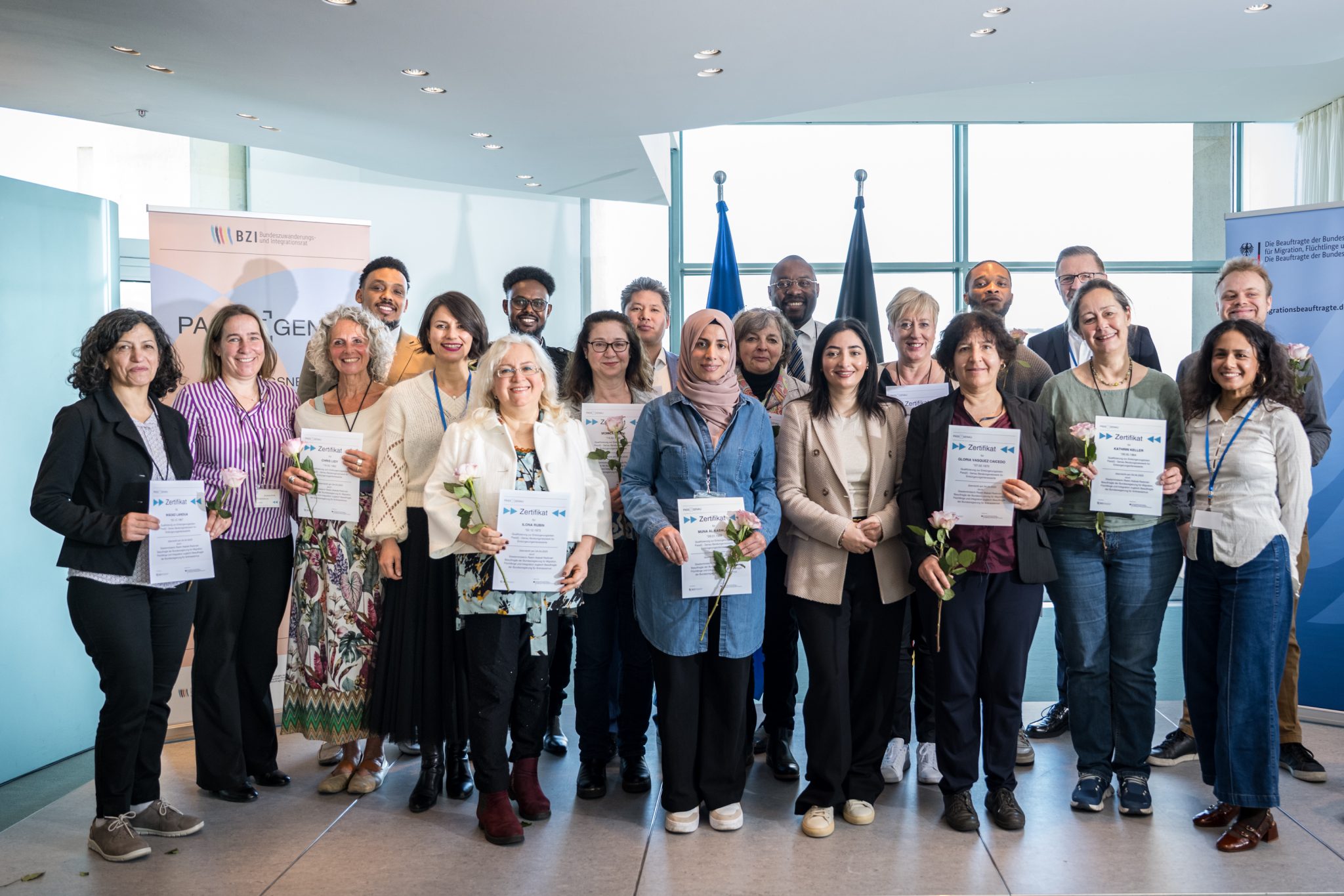 Nach dem spannenden Gespräch wurden die Zertifikate durch die Staatsministerin und den BZI-Vorstand übergeben. Die Zertifikate bescheinigen die Teilnahme an allen drei Schulungsmodulen und signalisieren den Start der Tätigkeit als Einbürgerungslots*innen. Die feierliche Veranstaltung wurde abgerundet mit einem Get-Together im Kanzleramt mit Häppchen. Die Referentin im Arbeitsstab, Frau Stephanie Tonn, stand dabei noch für fachliche Fragen zur Einbürgerungspraxis bereit. Insgesamt war es eine sehr gelungene und feierliche Übergabe, welche die Wertschätzung der ehrenamtlichen Tätigkeit der Einbürgerungslots*innen gebührend zum Ausdruck brachte.